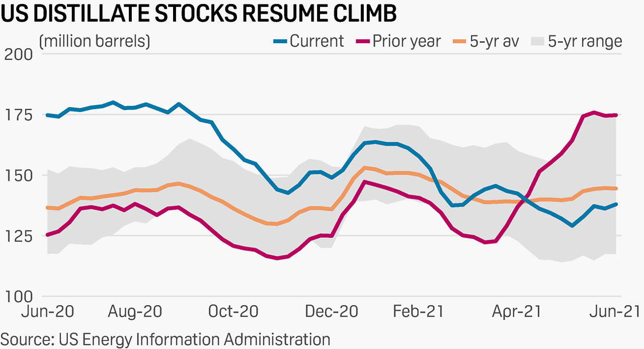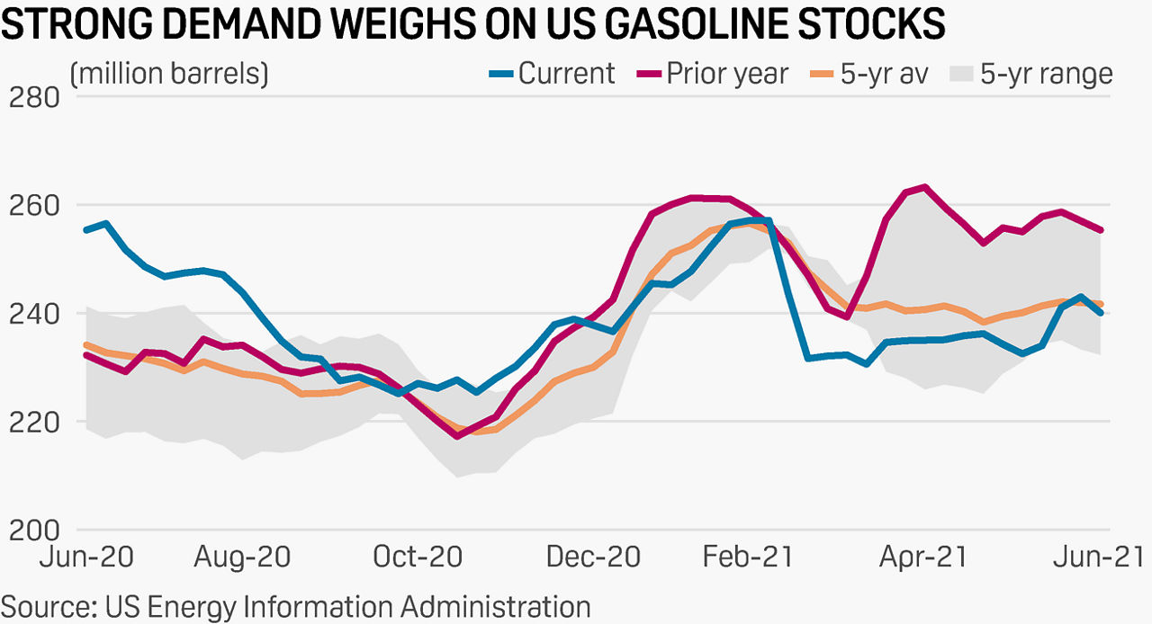 The draw comes as total product supplied for gasoline, EIA's proxy for demand, climbed nearly 1% to a four-week-high 9.44 million b/d, testing highs last seen in February 2020 prior to the first wave of pandemic lockdowns.