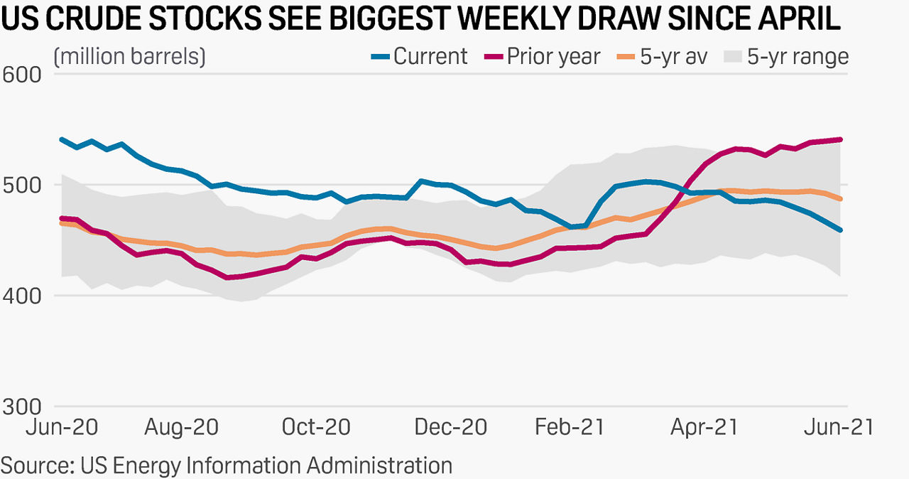 Total US crude stocks saw their largest weekly draw since late April, falling 7.61 million barrels to 459.06 barrels, EIA said, leaving them nearly 6% behind the five-year average.