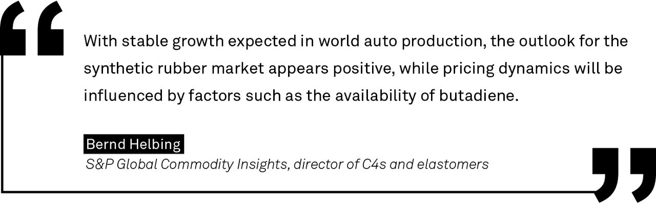 "Synthetic rubber remains indispensable to automobile tires," said Bernd Helbing, director of C4s and elastomers at S&P Global Commodity Insights. "With stable growth expected in world auto production, the outlook for the synthetic rubber market appears positive, while pricing dynamics will be influenced by factors such as the availability of butadiene."