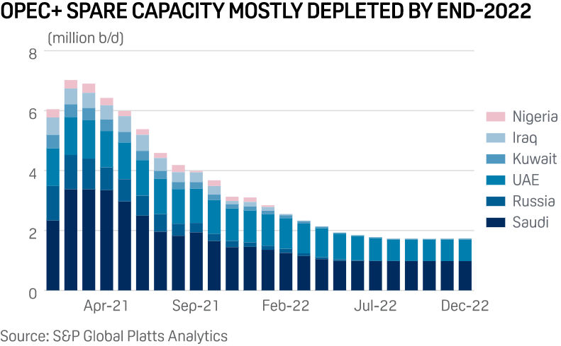 Several OPEC+ countries have struggled to increase production, either due to underinvestment, civil unrest or western sanctions. That has left the bulk of the world's spare production capacity in the hands of Saudi Arabia and the UAE, both of whom have shown no inclination to pump beyond their quotas.