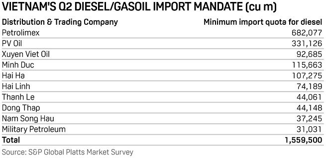 According to local media reports, Vietnam's Minister of Industry and Trade has mandated ten oil companies Feb. 24 to collectively import a minimum of 2.4 million cu m of oil products in the second quarter of 2022, including 1.56 c um of diesel.