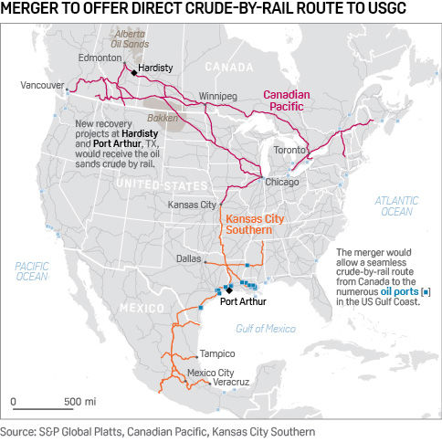 Houston — The $25 billion combination of Canadian Pacific Railway with Kansas City Southern creates the first single-path crude-by-rail gateway from Alberta to the Houston-area refining and export network, but it does not mean overall Canadian crude volumes to the US Gulf Coast are going to surge.