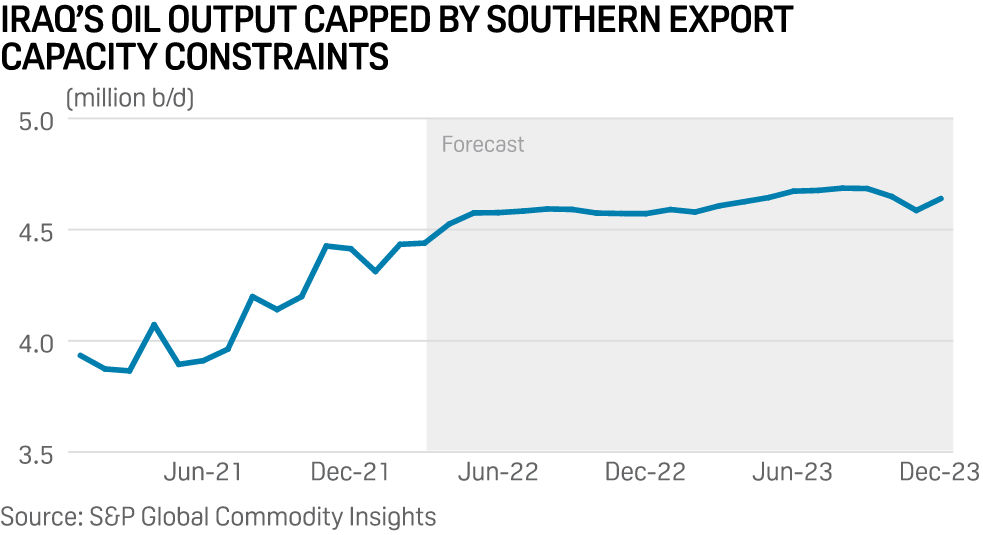 Doubts about Iraq's ability to export more crude, especially from its southern oil terminals, point to difficulties for the country to hit its OPEC+ quota. Iraq pumped 4.34 million b/d in March, up 80,000 b/d from February and slightly under its OPEC production cap of 4.37 million b/d, according to the latest S&P Global Commodity Insights survey.