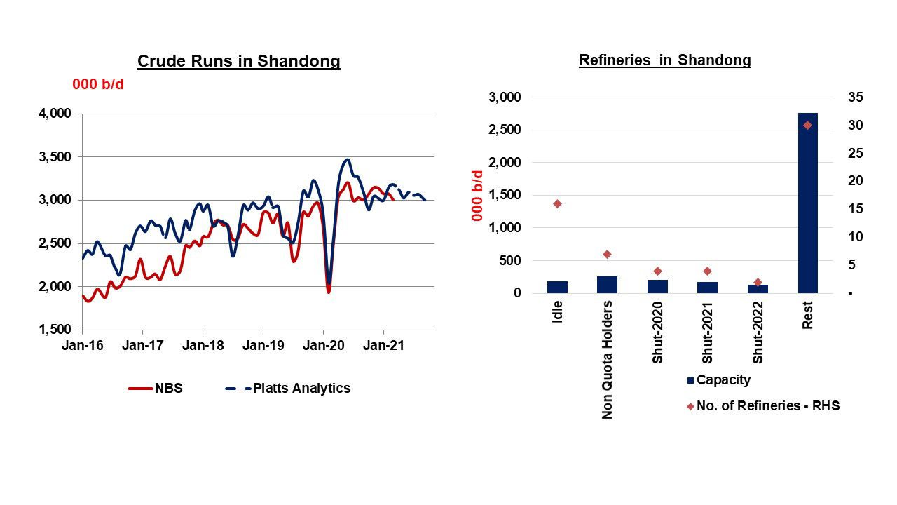 Many more players could shut in the coming months, whether in exchange for new larger capacities, according to Shandong government's plans to upgrade its refinery sector, or perhaps forced to do so, especially if they do not own rights to process imported crudes. And when they do, the scale of under-reported runs, which is due to the general tendency for errant refineries to report less, and the incidences of tax evasion will also probably wane.