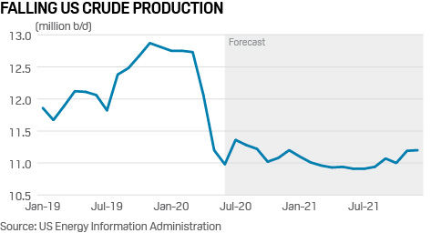 US oil production is expected to bottom out at 10.907 million b/d in July 2021.