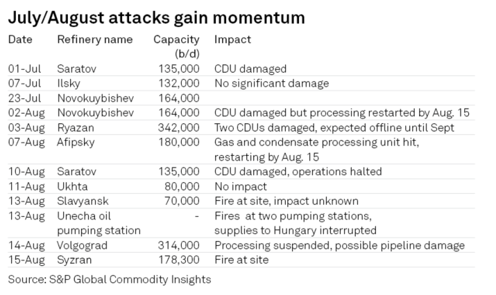 In the week to Aug. 14 alone, it struck five Russian refineries, including the major 314,000 b/d Volgograd complex and other large-scale facilities Syzran, Afipsky, and Saratov.
