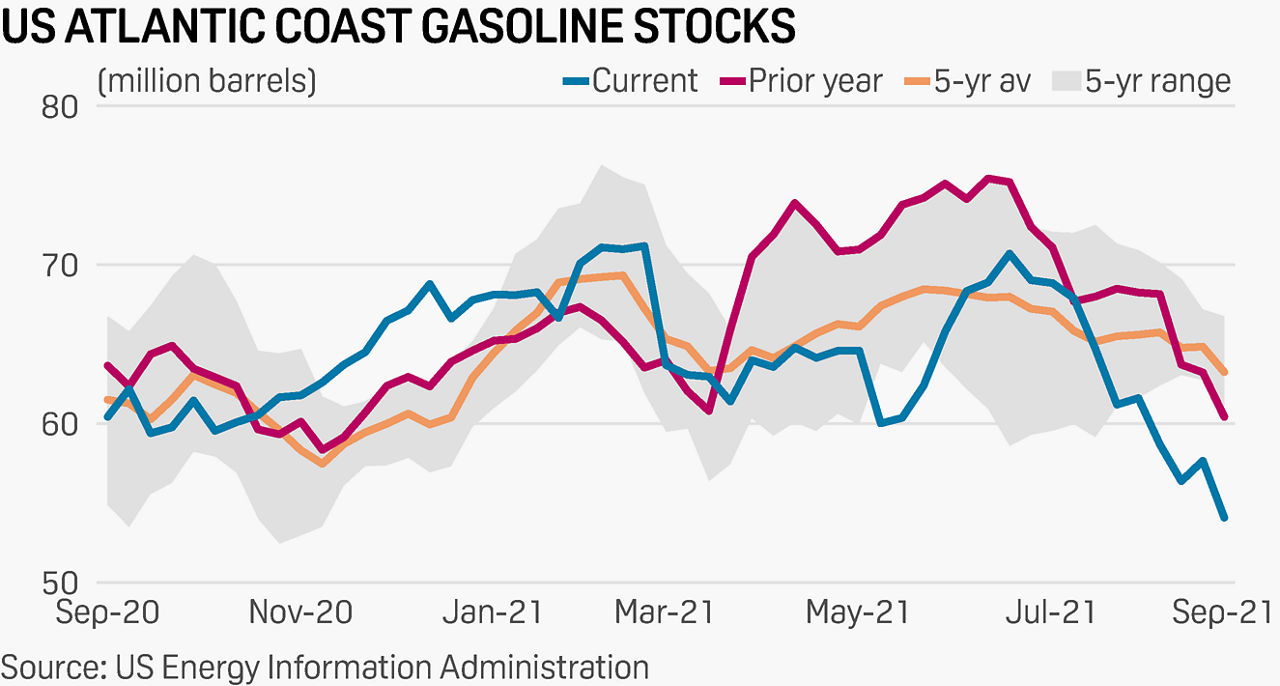 USAC gasoline inventories have fallen 16.6 million barrels since late June to 54.1 million barrels, putting stocks at 15% below the five-year average, US Energy Information Administration data shows.