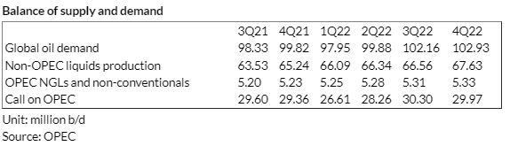 OPEC expects the call on its own crude to rise to 28.80 million b/d for 2022.