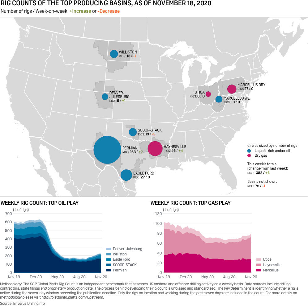 Houston — The US oil and natural gas rig count rose by three to 382, Enverus said Nov. 19, ahead of the Thanksgiving holiday week when drilling typically slows as upstream budgets wind down toward year-end.
