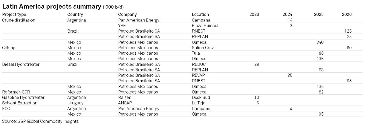 In Mexico, refinery inputs peaked in January 2023 at 834,000 b/d, but inputs are expected to rise by 2025 with the startup of the new Dos Bocas refinery.