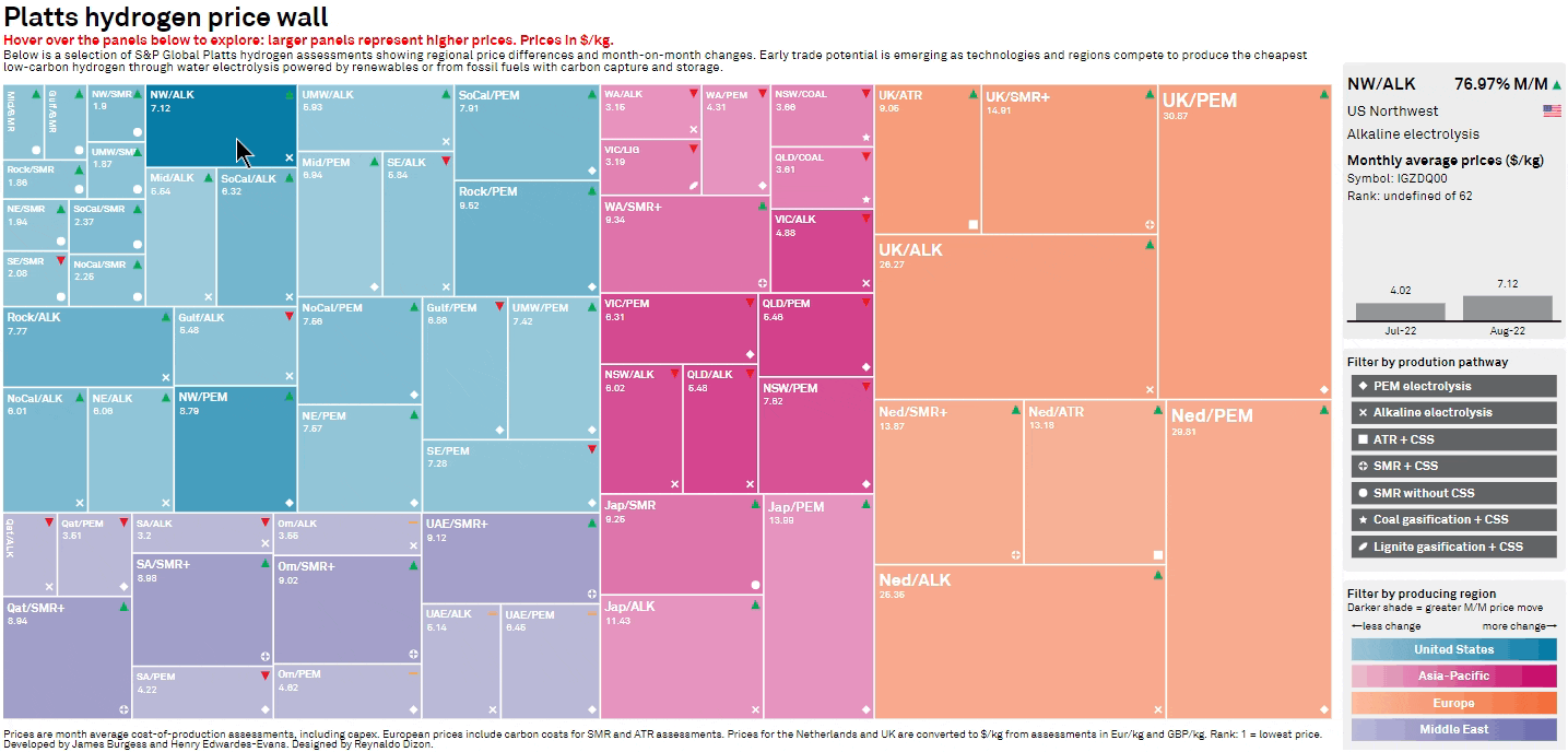 Platts' Hydrogen Price Wall shows the world's cheapest electrolysis-based hydrogen as assessed by S&P Global Commodity Insights derives from Western Australia, the US, and the Middle East. The cost of producing hydrogen by alkaline electrolysis in Western Australia averaged $3.15/kg in August, compared with $25.35/kg in the Netherlands, based on month-ahead grid power prices.