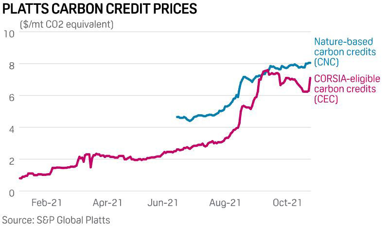 S&P Global Platts assessed CORSIA-eligible carbon (CEC) credits at $7.30/mt CO2 equivalent Oct. 27, compared with just 80 cents/mt when the assessment was launched on Jan. 4, 2021.