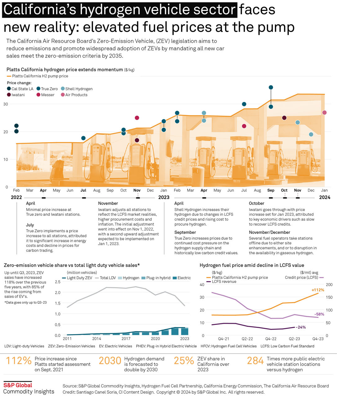 California has faced challenges in decarbonizing its transportation sector using hydrogen as a zero-emission vehicle (ZEV) fuel option. At the heart of it are a lack of reliable infrastructure and prolonged elevated hydrogen prices at fueling stations, according to an analysis by S&P Global.