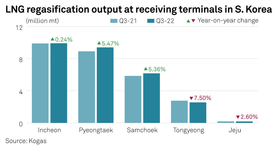 Kogas owns five out of the seven regasification terminals in the country, which includes Incheon, Pyeongtaek, Samcheok, Tongyeong and Jeju -- accounting for about 89% of the total capacity in the country. The company has a combined LNG storage capacity of around 11.6 MMcm, according to market sources.