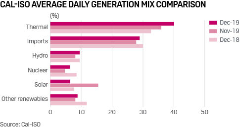 Thermal generation remained the lead fuel source around 40% of the total mix in December, jumping 7.5 percentage points year on year, according to ISO data. Thermal output averaged 240,055 MWh/day for the month, an increase of nearly 28.5% year on year.
