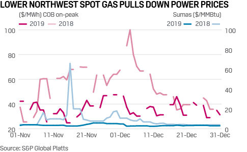 Across the five pricing hubs used in S&P Global Platts' monthly power analyses, COB on-peak day-ahead had the largest year-on-year drop at 32.9% to average $35.38/MWh in December, according to S&P Global Platts assessments.