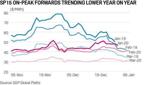 SP15 on-peak January averaged $45.65/MWh, down 24.3% from where the 2019 package averaged last year, but up 5% month on month. The 2020 package rolled off the curve at $46.05/MWh, $4.20 lower than where the 2019 package ended.