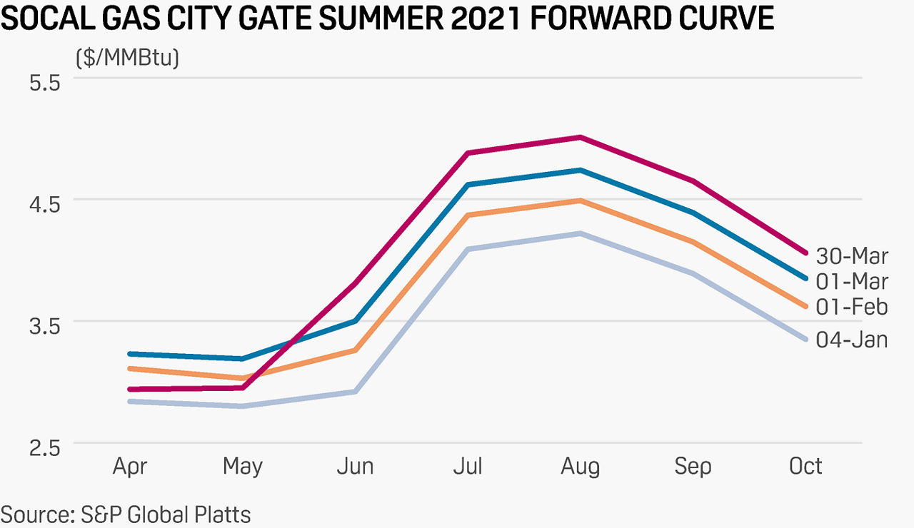 Since the start of January, the SoCal Gas city-gate April-to-October strip has gained 60 cents, or over 17%, most recently settling at an average $4.04/MMBtu, S&P Global Platts' M2MS forwards data shows.