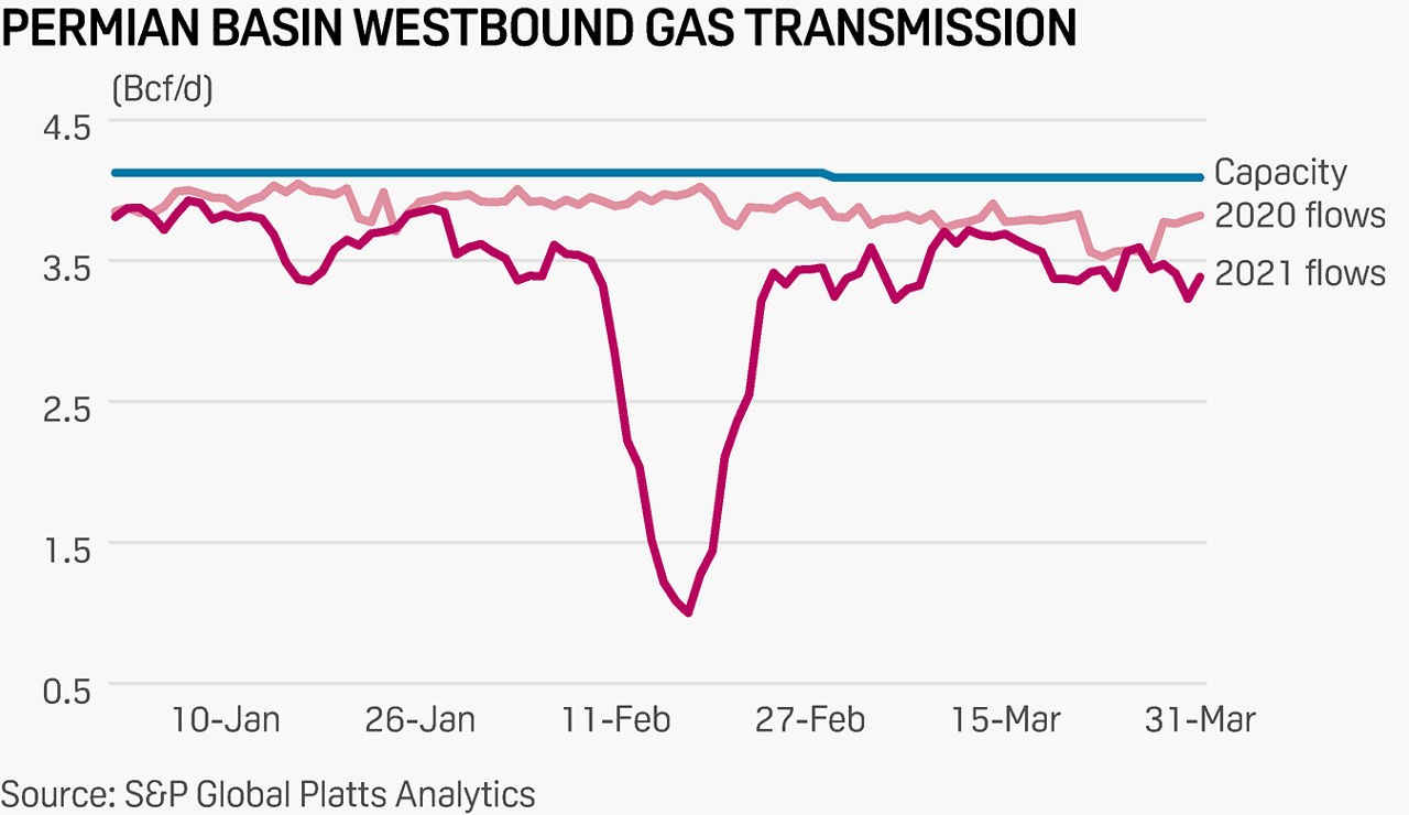 Through late March, output from the West Texas shale basin has averaged about 11.6 Bcf/d, according to data from S&P Global Platts Analytics. After reaching its zenith at over 12.8 Bcf/d in March 2020, production from the Permian fell sharply last summer amid a global fallout in commodity prices. It suffered another brief but steep decline last month amid a historic wellhead production freeze-off in Texas and the Midcontinent.
