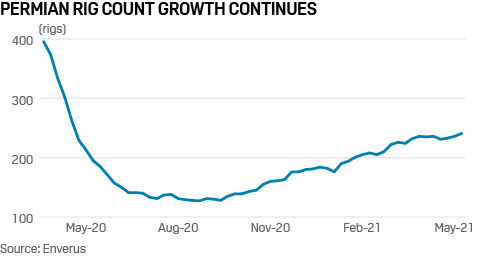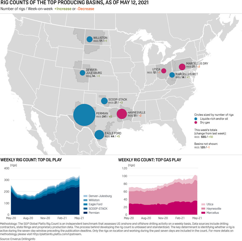 Houston — The US oil and gas rig count jumped 10 on the week to 555, rig data provider Enverus said May 13, as upstream operators wrapped up first-quarter calls on an optimistic note because of higher oil prices and an improving outlook for the rest of the year despite an uneven pandemic recovery.