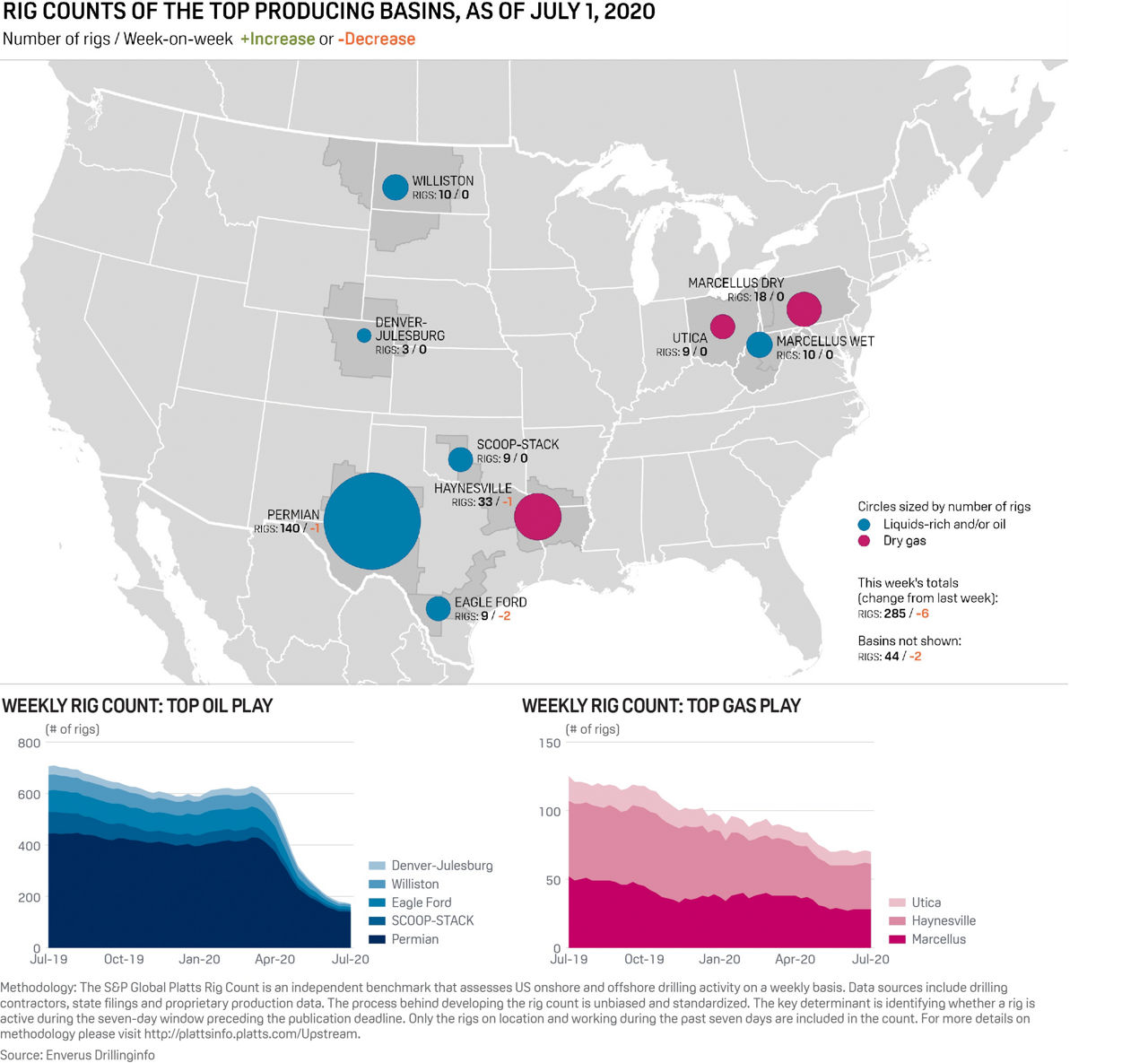 Years ago, the Bakken and the Eagle Ford in South Texas each had over 200 rigs running. On July 1, the Bakken had 10 rigs, unchanged on the week, while the Eagle Ford had nine rigs after losing two rigs from the previous week.