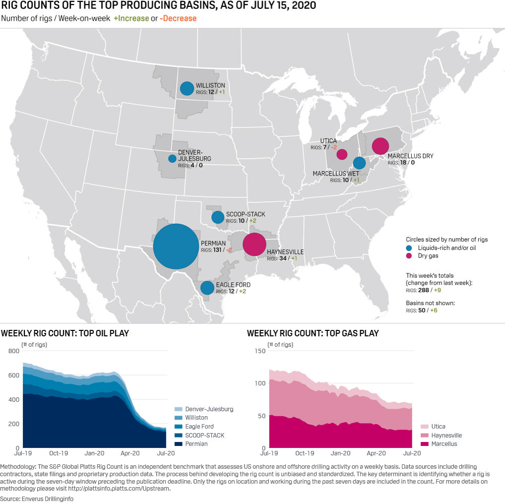 The current change from months of a steady drip of rig removals from US fields comes just ahead of second-quarter upstream conference calls which begin next week. Analysts expect the calls to focus chiefly on second-half outlooks for production and activity and preliminary glimpses into 2021 plans and spending.