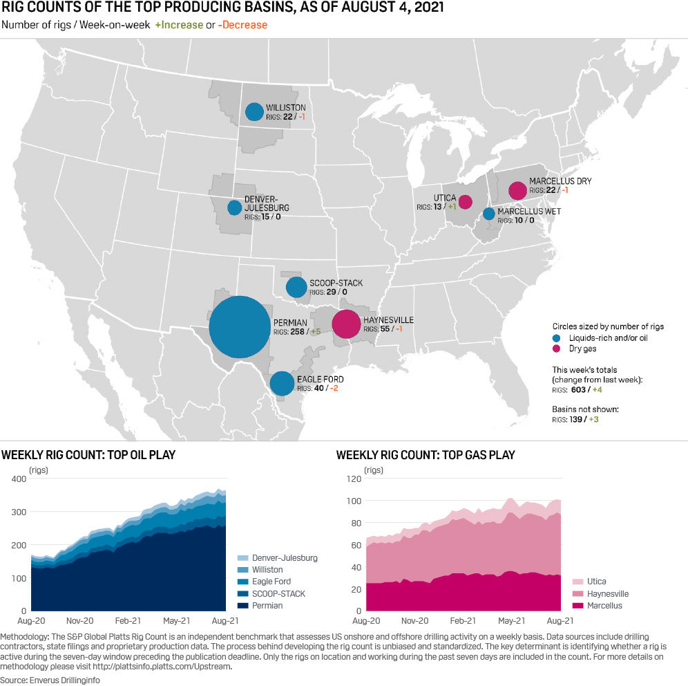 The US oil and gas rig count climbed four to 603 in the week ended Aug. 4 amid an uptick in Permian basin drilling activity, rig data provider Enverus said Aug. 5.