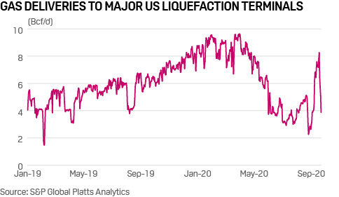 Total US feedgas demand dropped to 3.9 Bc/d -- the lowest level since Sept. 2 -- from 5.1 Bcf/d the day before, S&P Global Platts Analytics data show. Flows had surged to 8.3 Bcf/d, even with Cameron offline, on Sept. 18, just as Beta was approaching the US coast.