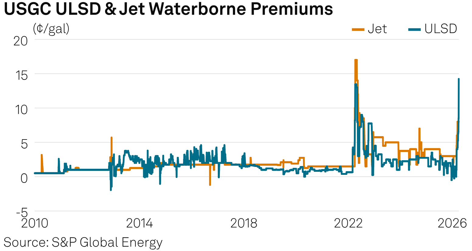 The USGC Jet waterborne assessment remained unchanged on the day at an 8 cents/gal premium to Gulf Coast pipe, its highest level since September 2024.