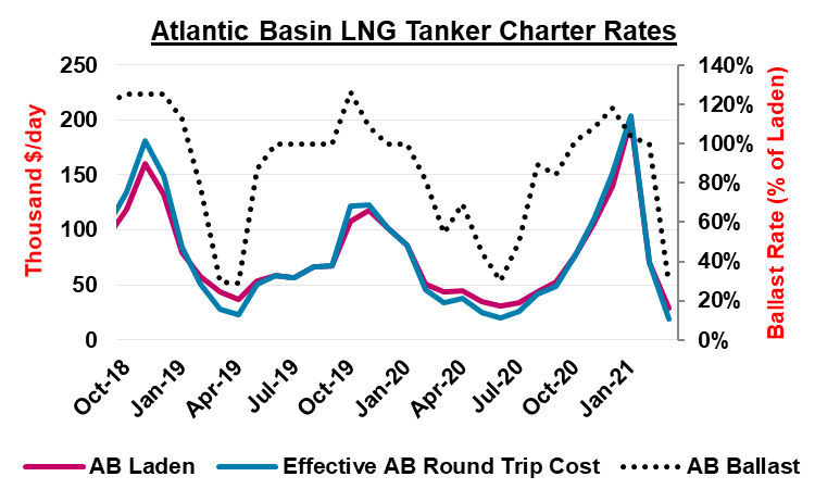 Fundamentally speaking, the collapse in charter rates is due to broadly weakening global spot trade as markets transition their regular springtime demand lull, which has been exacerbated by a large wave of newbuild LNG tankers that were put on the water this winter. Furthermore, USGC forward LNG netbacks have favored deliveries to the TTF in April, which has likely led to US spot cargoes reorienting back to Europe and thereby consuming less tanker capacity.