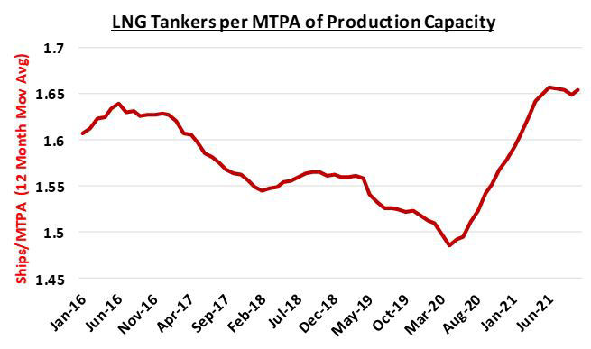 The effective round-trip day rate of around $15,625/d barely exceeds the average daily OPEX of an LNG tanker, which we estimate to be around $10,000-$15,000/d, depending on the age and technologies employed by the tanker. This suggests that tanker owners are essentially setting day rates at cost. On one hand, it might seem reasonable to assume that day rates are near a bottom. However, it is worth noting that in the short-run, most OPEX costs, such as salaries and insurance, are essentially committed fixed costs which cannot simply be canceled, month-to-month. Therefore, it is possible that day rates could fall below the daily OPEX for a short period of time if a tanker owner wanted to keep that tanker on the water and was concerned about keeping the tanker cool, while also anticipating market conditions will improve.