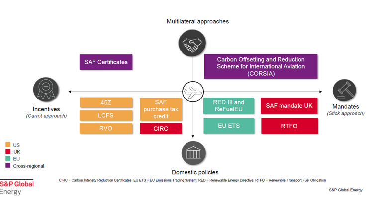 These national approaches sit alongside multilateral mechanisms, including SAF certificates and the Carbon Offsetting and Reduction Scheme for International Aviation (CORSIA), which provide pathways for emissions accounting and compliance in international aviation. Together, these layers create differentiated demand signals while collectively influencing SAF adoption, compliance value, and price formation across global markets.