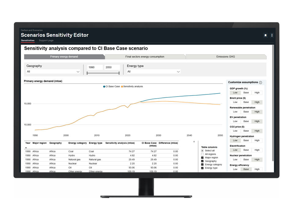 Analyze the impact of nine pre-defined assumptions against our base-case scenario with the Sensitivity Editor, quickly creating “What if?” analyses. What if the price of oil drops? What if electrification rates increase? See the impacts across energy demand, sector energy consumption, or GHG emissions in moments. Then use our Scenario Builder to adjust assumptions within the data for any of our five outlooks, allowing you to run customized sensitivities that enhance your understanding of potential energy futures. This powerful functionality enables you to obtain results in a matter of hours instead of weeks or months, revolutionizing your workflows.
