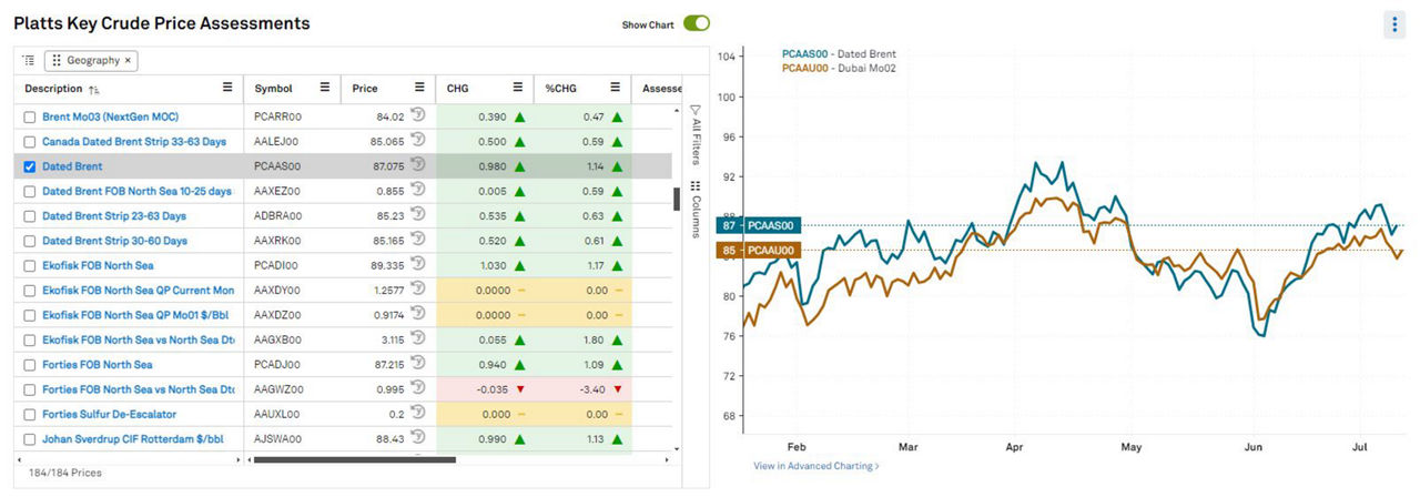 Our comprehensive crude oil data solutions provide daily spot and term oil prices, empowering traders, refiners, and producers to capitalize on market fluctuations with confidence. Access historical oil price trends and analyze oil market patterns to stay ahead of the competition. Covering over 160 liquid crude grades, including our flagship benchmarks—Platts Dated Brent™ and Platts Dubai®—we ensure you have the oil market insights you need.
