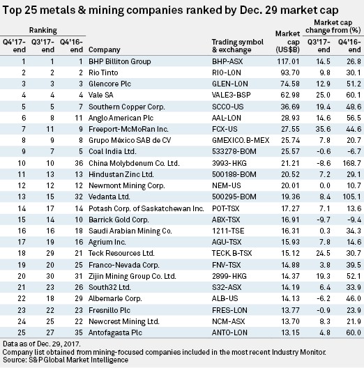 While most of the top 25 companies saw their market caps improve in both the fourth quarter and the year as a whole, Barrick Gold Corp.'s market cap declined quarter-on-quarter as well as year-on-year by 9%. As a result, the company recorded the steepest drop in annual ranking, slipping five places to 15th place. The company reported a net loss of US$11 million for the third quarter and attributed the loss to the reduced production, lower gold prices, and the impact of Tanzania's concentrate export ban on Acacia Mining plc's operations. North Carolina-based Albemarle Corp. also made its way into the top 25 in 2017, as the lithium producer's value rose to US$14.1 billion by the end of the year. By contrast, at the end of 2016, Albemarle was well outside the top 25 with a value of only US$9.68 billion. The company narrowed its guidance for full-year net sales and adjusted EBITDA after a strong performance in the third quarter despite Hurricane Harvey negatively affecting earnings.