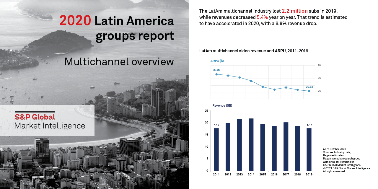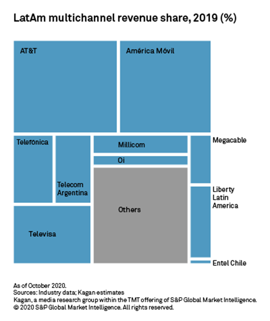 This article is based on Kagan's Latin America Multichannel & Broadband Market Overview report, which explores operational and financial trends affecting the telecommunications industry in the region. It also contains profiles, including footprint maps, for the top 11 telecommunications groups offering multichannel products in Latin America: América Móvil SAB de CV, AT&T Inc., Telecom Argentina, Liberty Latin America Ltd., Megacable Holdings SAB de CV, Millicom International Cellular SA, Telefónica SA , Grupo Televisa SAB, Oi SA, Entel Chile and Telecom Italia SpA.
