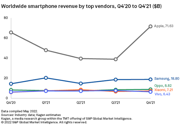 While Samsung ceded the top spot for shipments to Apple in the fourth quarter, it maintained the lead for full year 2021, shipping an estimated 270.0 million units, up 5.1% over 2020. A growing share of the flagship S-series and ultra-premium Z-series foldables among its total shipments, together with 5G upgrades for its entry-level and midrange lineups, produced a 19% year-on-year increase in average selling price for 2021 at $268 per device.