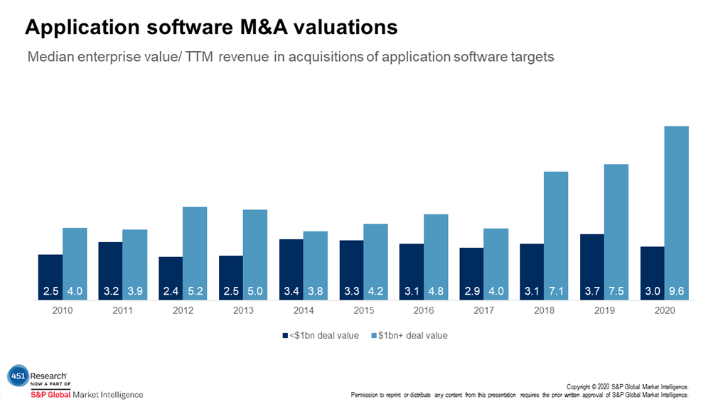 Rising equity prices underpinned 2020's rush of application software M&A. The S&P 500-Information Technology index surged 42% during the year, according to S&P Global Market Intelligence. As it did, valuations of both buyers and sellers ticked up. Salesforce, for example, was valued a bit above 9x trailing revenue at the start of 2020. The CRM giant was trading at 11.5-12x trailing revenue in the days leading up to its acquisition of Slack. No doubt that helped it justify paying 36x for the communications software maker.