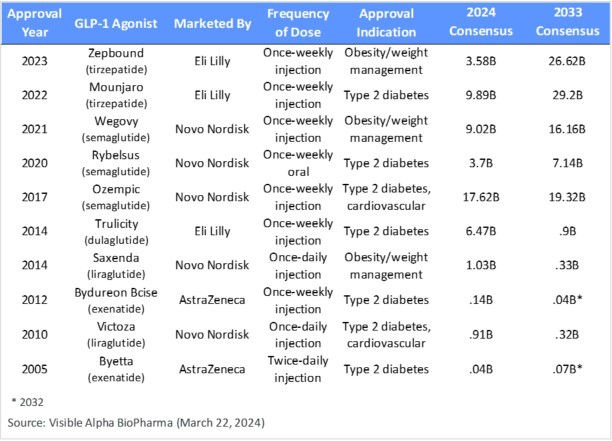 Based on Visible Alpha consensus, the five leading GLP-1-based drugs (Ozempic, Rybelsus, Wegovy, Mounjaro, and Zepbound) combined, ramp up from $44 billion in projected revenues in 2024 to almost $99 billion in projected revenues in 2033 (Table 1).