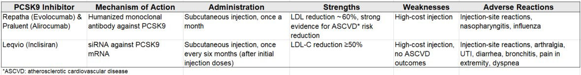 Adapted from Agnello et al; J. Clin. Med. 2024, 13, 125. Repatha (MRK) and Praluent (SNY & REGN) are monoclonal antibodies against PCSK9. Leqvio (ALNY and NVS) is RNA interference/siRNA targeted against PCSK9 mRNA. All three approved PCSK9 inhibitors are injections.