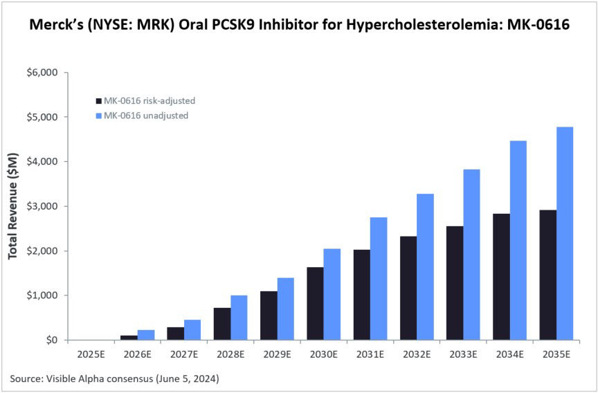 According to Visible Alpha consensus, analysts project that MK-0616 will be on the market in 2026 and reach an estimated $4.8 billion in revenues by 2035. Risk-adjusted revenues in 2035 are an estimated $2.9 billion. Visible Alpha consensus probability of success for MK-0616 approval is 67.4%. If approved, MK-0616 will be the first oral PCSK9 inhibitor on the market. An oral PCSK9 inhibitor is expected to have advantages over the currently marketed PCSK9 inhibitors that are all injections.
