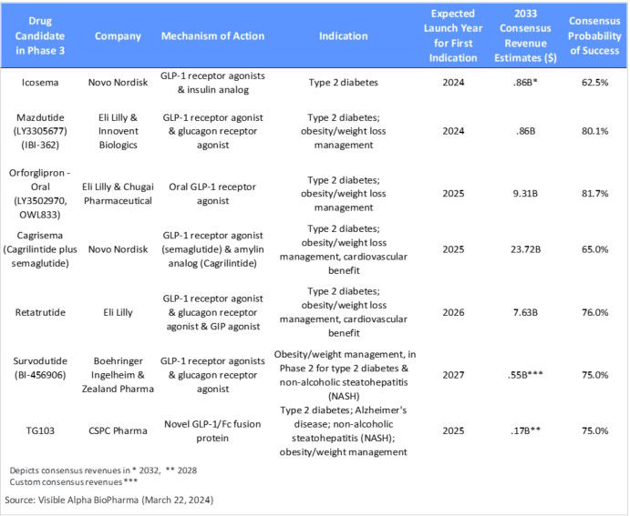 (Change from the previous GLP1 Monitor – Pfizer’s Danuglipiron, in Phase2, has been removed from pipeline drug candidates, to depict only lead Phase 3 drug candidates) Source: Visible Alpha BioPharma consensus (March 22, 2024); forecasts are in millions of U.S. dollars