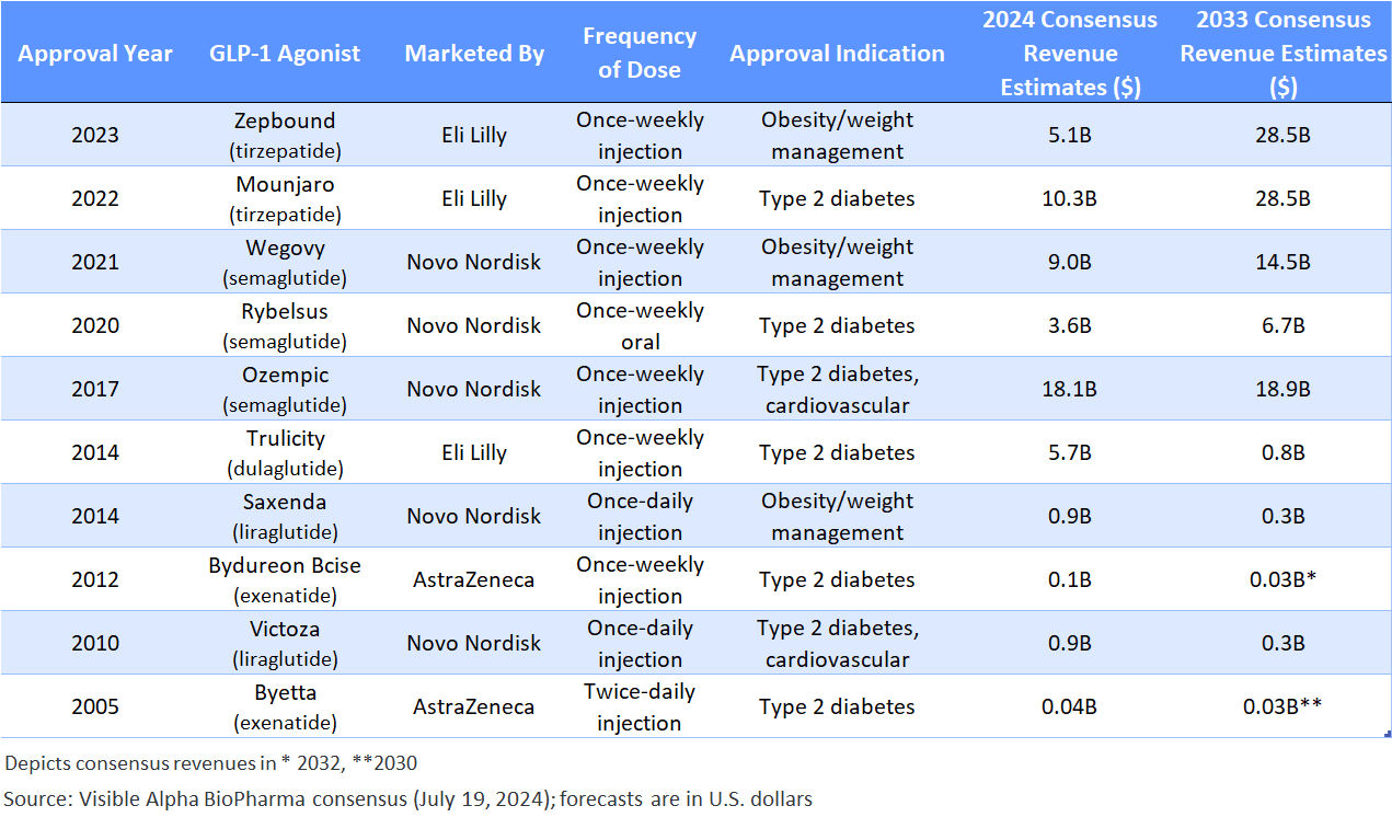 The Visible Alpha GLP-1 Drug Monitor tracks the current and projected growth of the GLP-1 (glucagon-like peptide-1) receptor agonist family of therapeutics marketed by publicly traded companies for type 2 diabetes, obesity or weight management, and other indications. The monitor evaluates both approved GLP-1 drugs and developing GLP-1 pathway-related drug candidates in the pipeline based on revenue potential while taking into account innovation and mechanism-of-action impact as well as clinical and regulatory risk. This update follows the first GLP-1 monitor published on March 26, 2024.