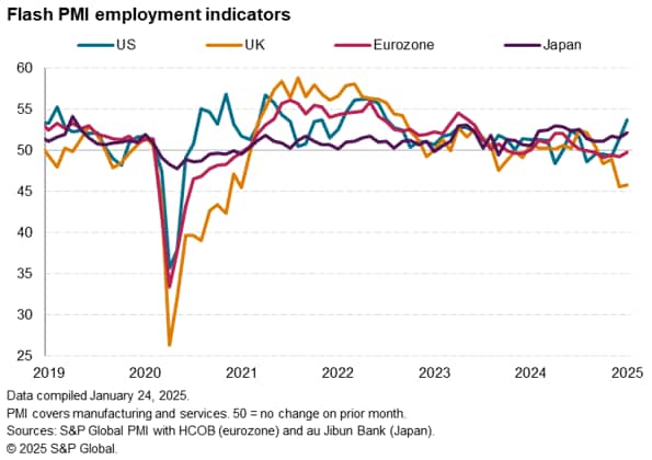 In the US, the Trump administration's optimistic outlook for the domestic economy has unleashed 'animal sprits' in the form of higher confidence and hiring in the PMI survey. In the UK, the new government has presented a more downbeat assessment of economic challenges, focusing on fiscal discipline amid a longer-term growth focus. Strong growth and optimism seen in the UK PMI prior to their election has consequently faded.