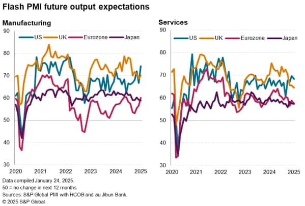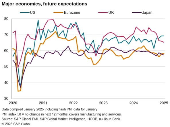 However, business confidence about the year ahead remains especially elevated in the US compared to subdued readings in the eurozone, UK and Japan. This optimism has been matched by much stronger hiring in the US than elsewhere at the start of 2025. That said, there are some pockets of stronger optimism appearing elsewhere, notably in the German manufacturing sector.