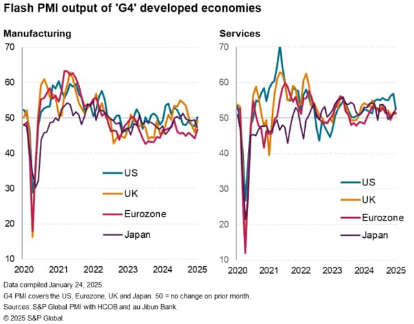 The new year brought a narrowing of the recent economic divergence seen among the G4 largest developed economies. Whereas the US has continued to outpace its peers in January, as was the case throughout much of 2024, its pace of expansion slowed while growth improved elsewhere.