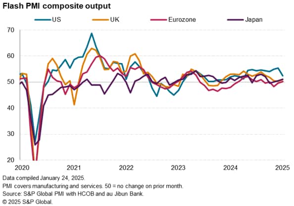 While the US PMI remained higher than equivalent numbers in Europe and Japan, it was the only economy to see the PMI turn lower. The eurozone flash PMI rose from 49.6 in December to 50.2 in January, edging back into growth territory after two months of decline, while the UK PMI nudged up to 50.9 from 50.4. Japan's equivalent PMI reading was 51.1 from 50.5 in December.
