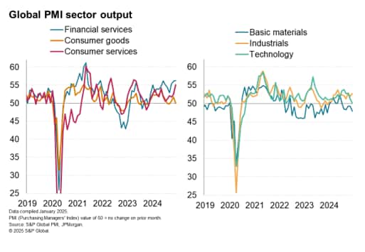 While the eurozone, UK, Japan and Australia all reported higher services output, all four reported lower manufacturing output in the closing month of 2024, with especially steep factory output falls seen in the eurozone, UK and Australia. Canada bucked the trend, with higher factory output reported, but it was the only major developed economy to report lower services activity.