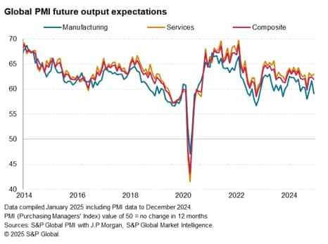 Looking to 2025, worldwide business expectations for output in the year ahead remained well above the near-two-year low seen in September, which had seen sentiment slump on uncertainty over the US election outcome. Sentiment nonetheless remained below the long-run average, having dipped slightly again in December, due principally to ongoing geopolitical concerns and intensifying economic growth worries.