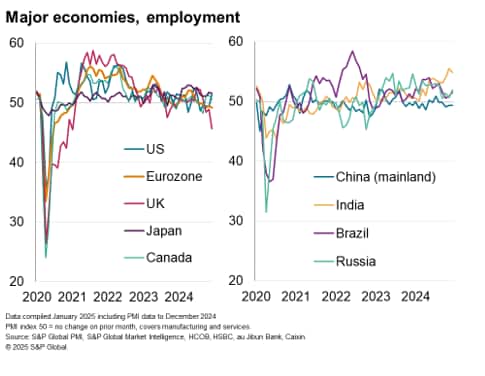 In the major emerging markets, robust (near-survey-record) job gains in India were accompanied by further net job creation in Russia and Brazil, but jobs were cut for a fifth straight month in mainland China.